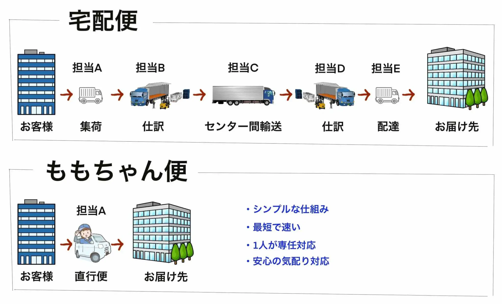 「ももちゃん便」は集荷からお届け先までノンストップでお届けするため、最速でお届けいたします。また、お荷物は一個につき専任のスタッフが責任を持ってお運びいたしますので、特別なお荷物にも安心してお任せください。